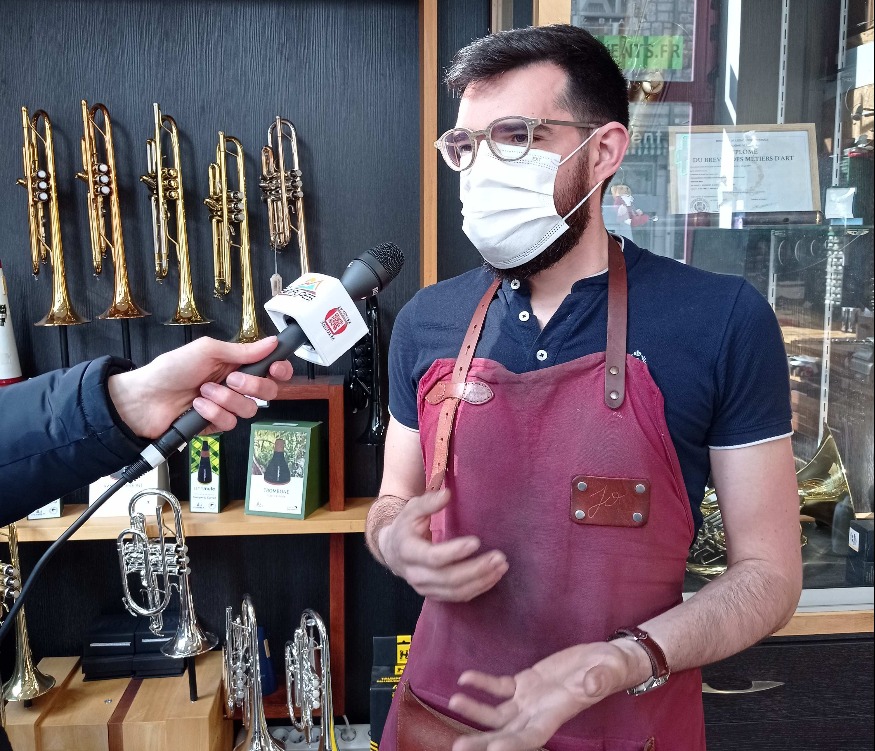 Photo : Jonathan au micro de SunAlpes Radio, au magasin-atelier rue Royale à Annecy.
