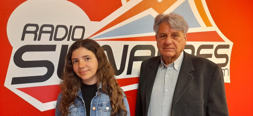 Photo : François Lavigne Delville, Maire de Viuz-la-Chièsaz et Maelis, jeune chanteuse de 12 ans, dans les studios de SunAlpes Radio.