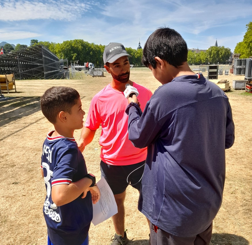 Photo : Saïd et nos jeunes journalistes à quelques mètres des tribunes sur le Pâquier à Annecy.