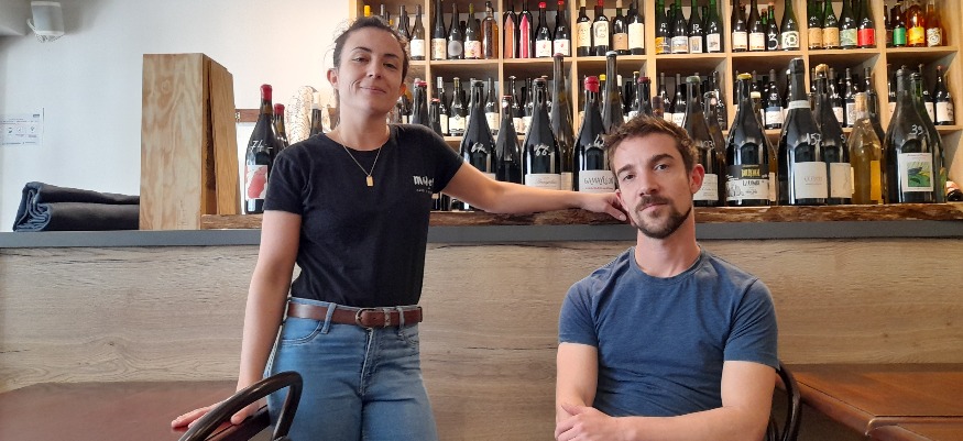 Photo : Carine et Benjamin, avec en toile de fond un aperçu des plus de 400 références de vins à la carte.