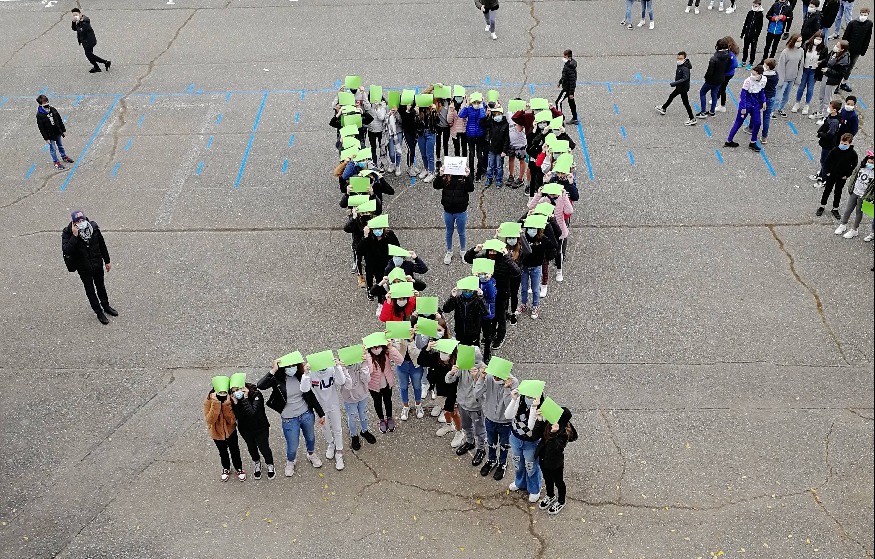 Photo : Le ruban vert, symbole de la lutte contre le Harcèlement scolaire, resprésenté dans la cour du collège par les élèves. / *Chiffres de l'UNICEF