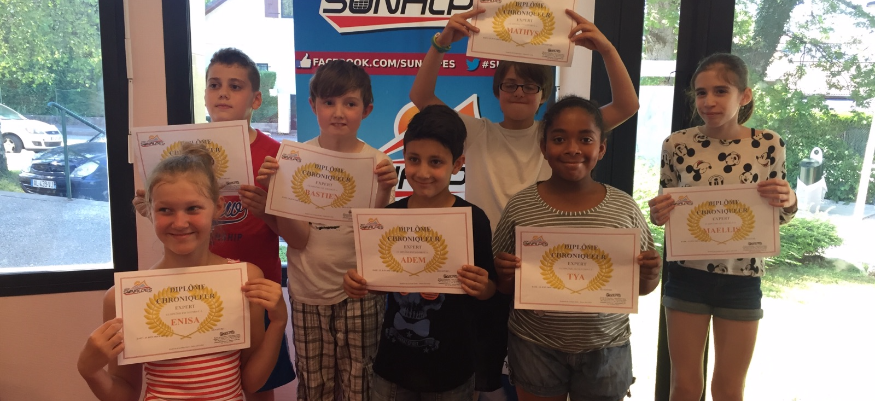 Photo : Les jeunes chroniqueurs prennent la pose devant les parents avec leurs diplômes...
