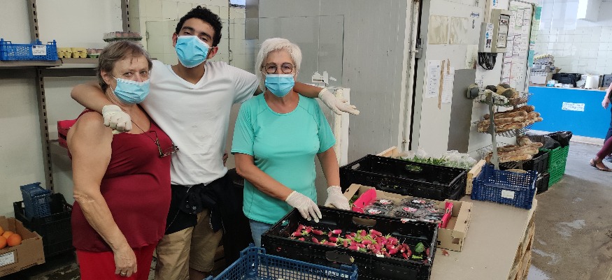 Photo : Trois bénévoles sur la distribution alimentaire.